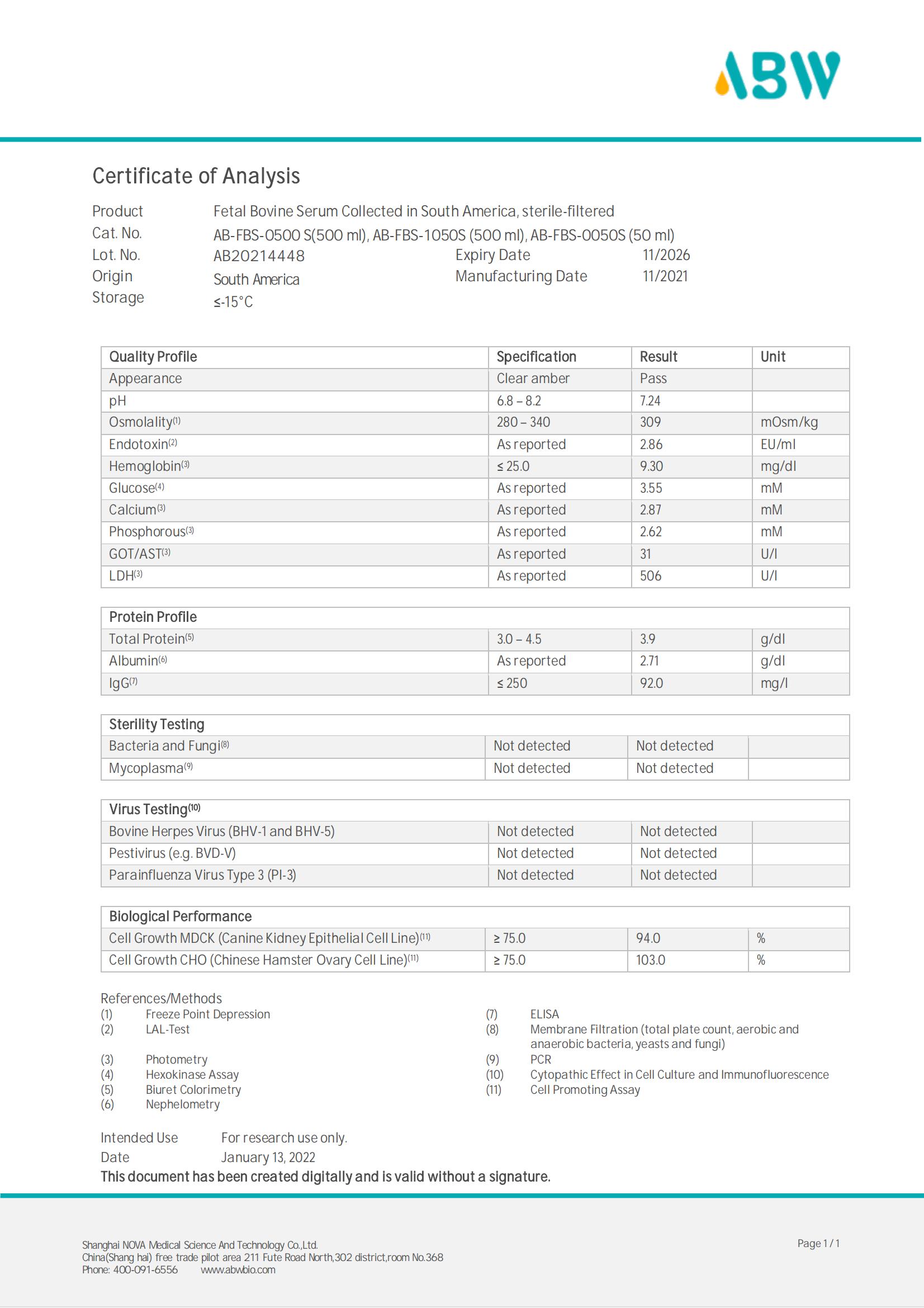 血清 COA