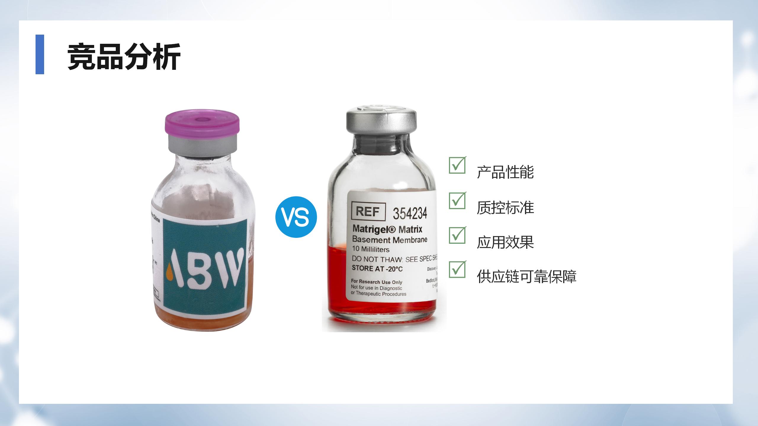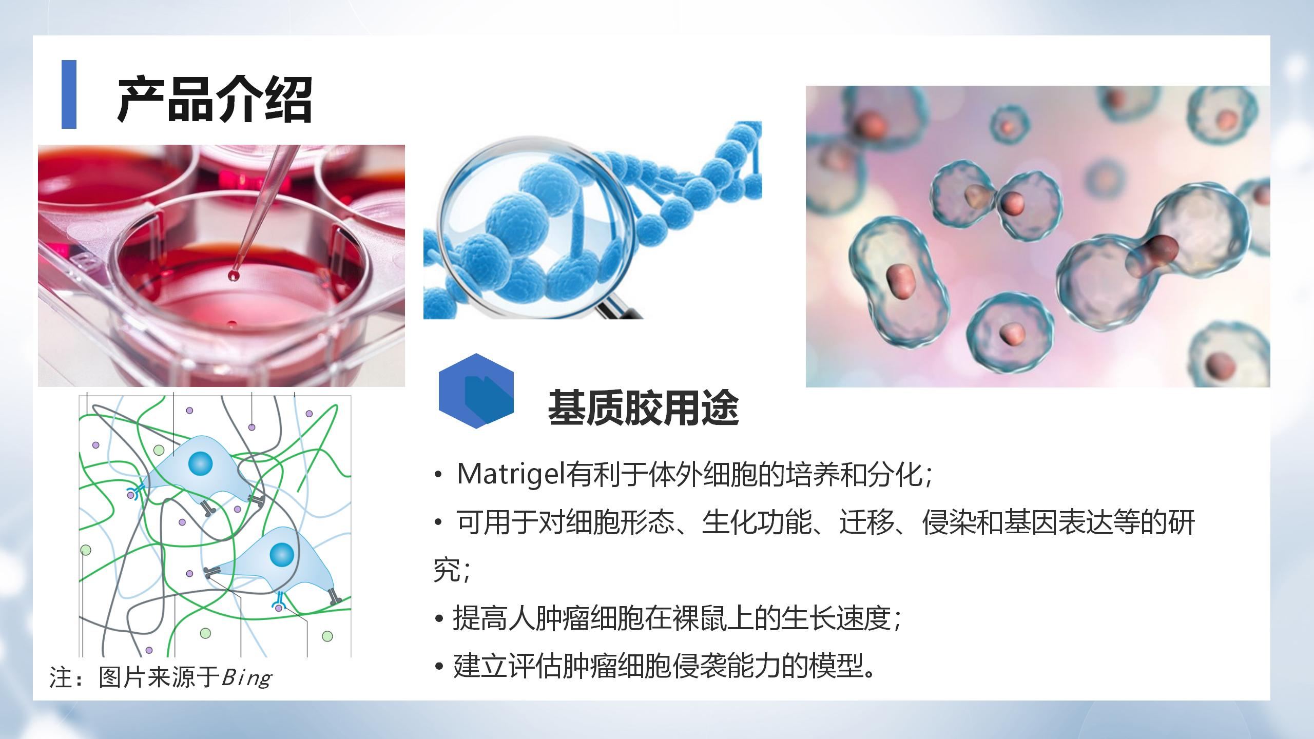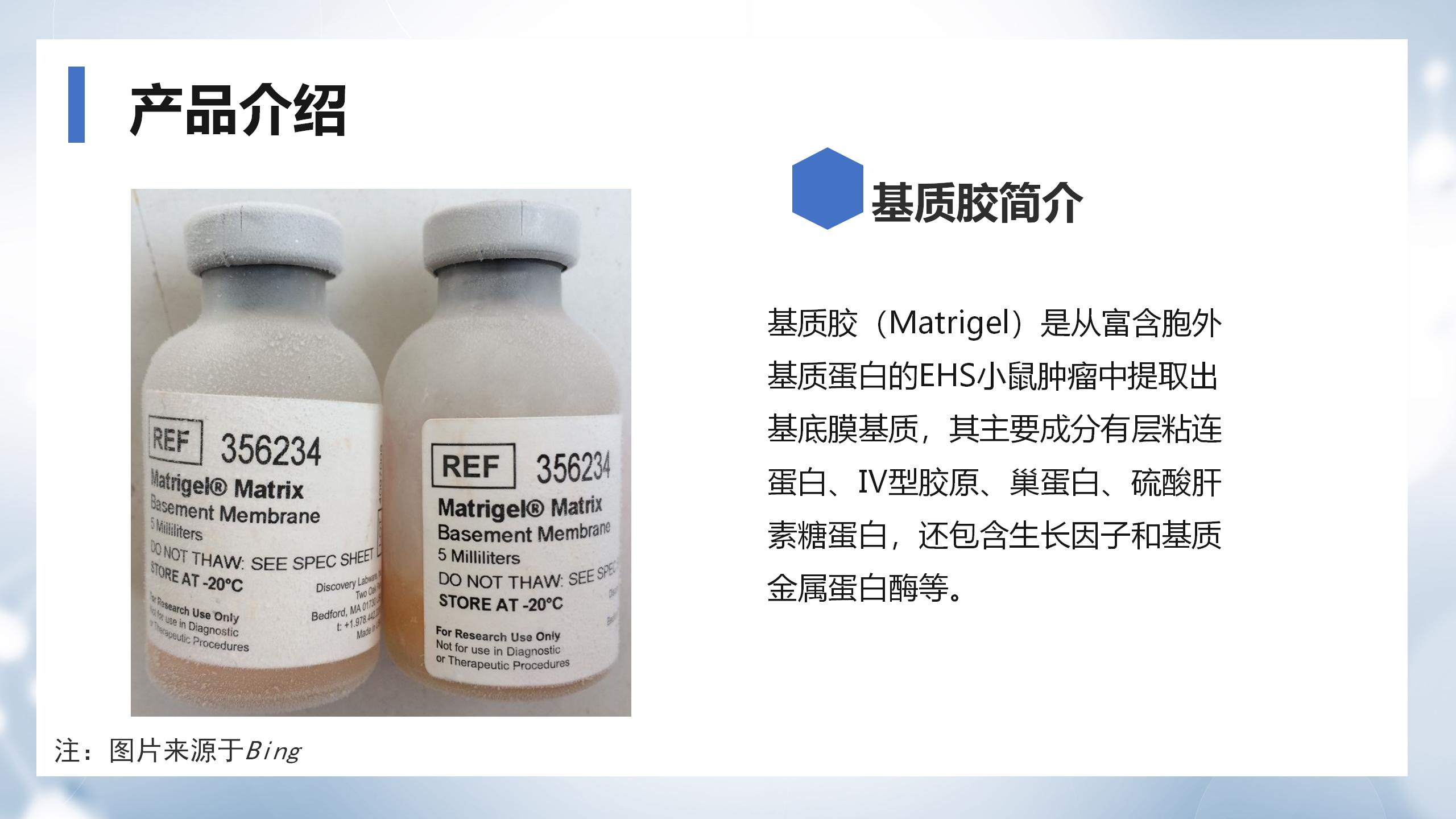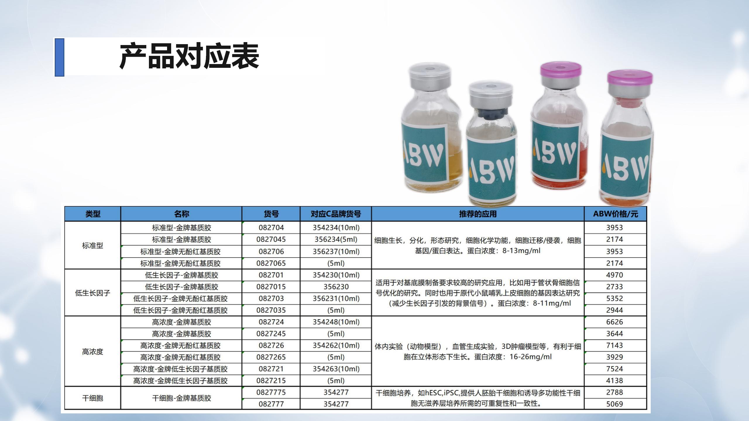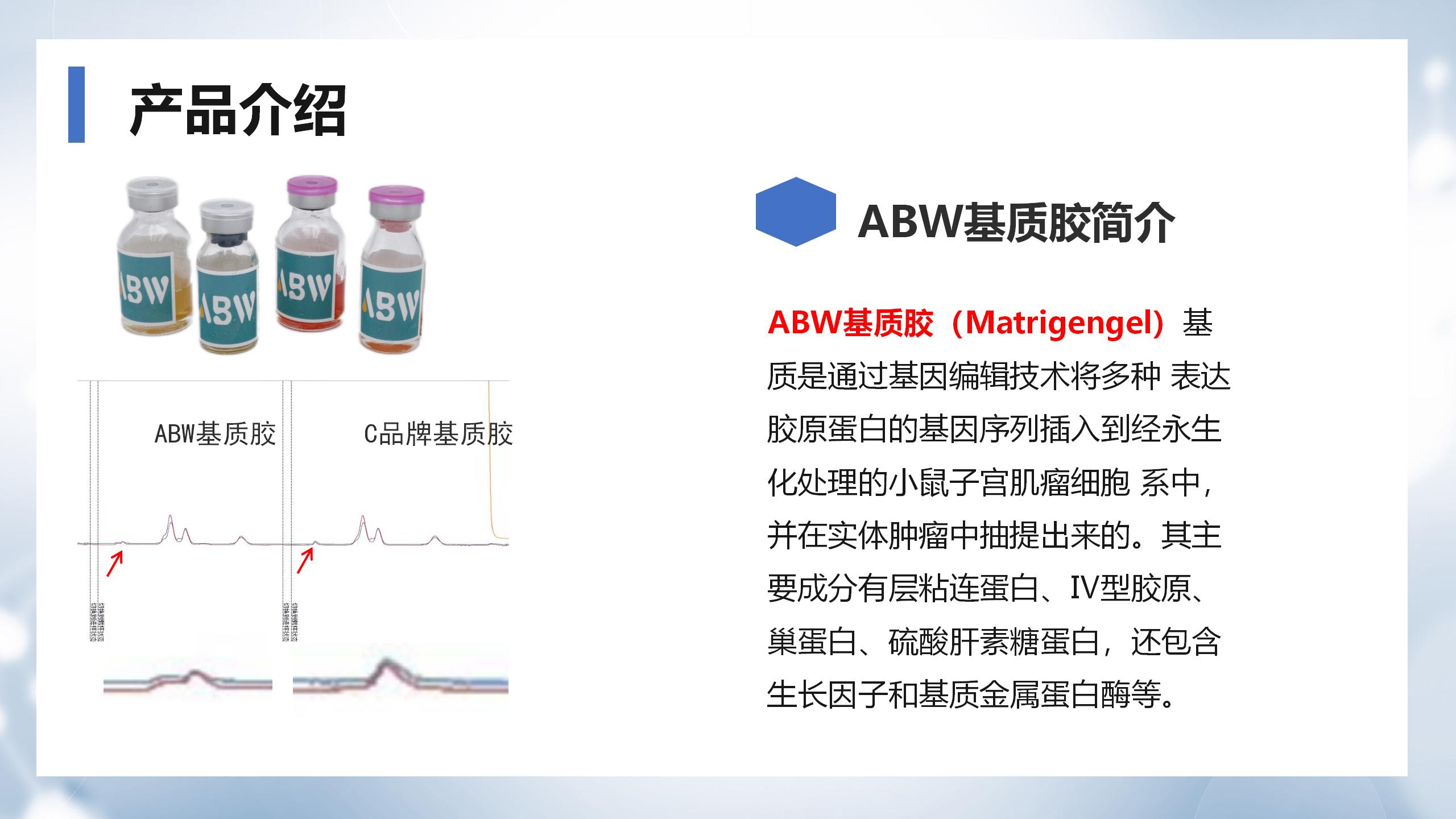 ABW基質膠(Matrigengel)基質是通過基因編輯技術將多種 表達膠原蛋白的基因序列插入到經永生化處理的小鼠腫瘤細胞系中,并在實體腫瘤中抽提出來的。其主要成分有層粘連蛋白、Ⅳ型膠原、巢蛋白、硫酸肝素糖蛋白,還包含生長因子和基質金屬蛋白酶等。