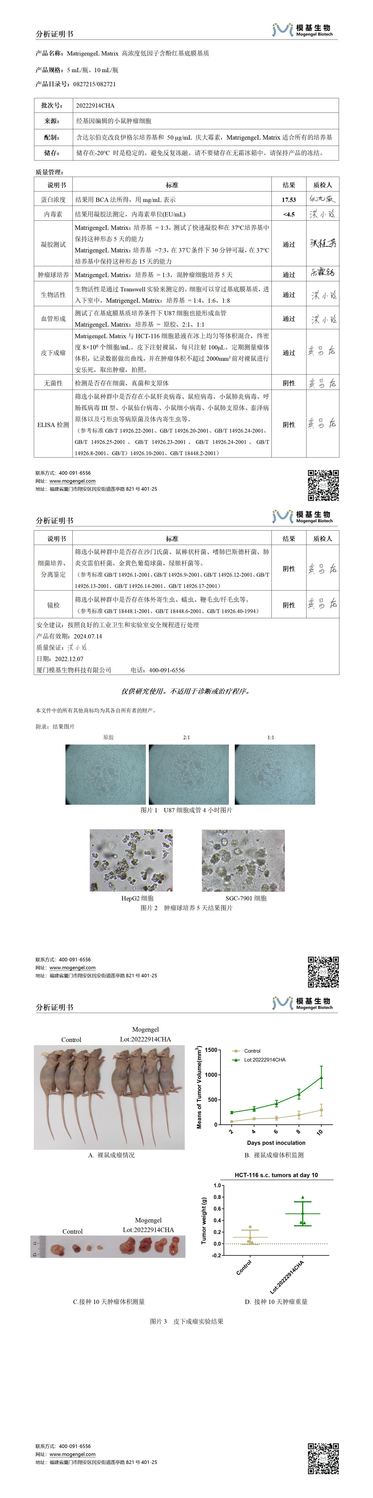 ABW基質膠(Matrigengel)基質是通過基因編輯技術將多種 表達膠原蛋白的基因序列插入到經永生化處理的小鼠腫瘤細胞系中,并在實體腫瘤中抽提出來的。其主要成分有層粘連蛋白、Ⅳ型膠原、巢蛋白、硫酸肝素糖蛋白,還包含生長因子和基質金屬蛋白酶等。