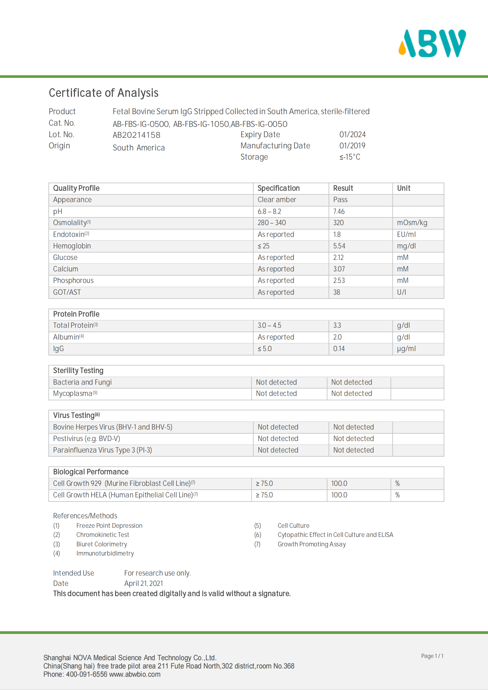 ABW血清產品血源地來自烏拉圭,德國工藝加工,原裝進口產品,批間穩定性高。